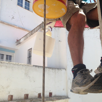 Para recibir con honores el verano hemos decido poner La Casa Grande de punta en blanco. Sin Hume, es decir, Daniel Moreno y su equipo, Pablo y Manuel, se han lanzado a «hacer deporte» como les jaleaban algunos atónitos viandantes, colgándose por los muros de la casa de la calle Maldonado para restaurar y pintar la fachada. Han reparado las cornisas superiores. Luego le dieron un buen «chorreo» a toda presión a los muros y al portal de piedra. Vino a continuación una imprimación y sobre ella dos manos de una pintura elastómera -casi atómica -, limpieza y pintado de cierros (balcones en la provincia de Cádiz), rejas y verjas. Ahora se puede leer claramente en el dintel que la fecha del escudo frontal de la casa es de 1710. Tras ello dieron una capa de hidrófugo para proteger esta hermosa piedra dorada.