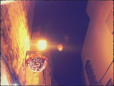 | en Arcos, enviando al cielo una lámpara en estas fiestas. Las fotos las tomó Estrella con su móvil |
