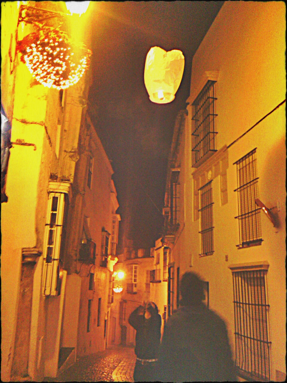 | en Arcos, enviando al cielo una lámpara en estas fiestas. Las fotos las tomó Estrella con su móvil |