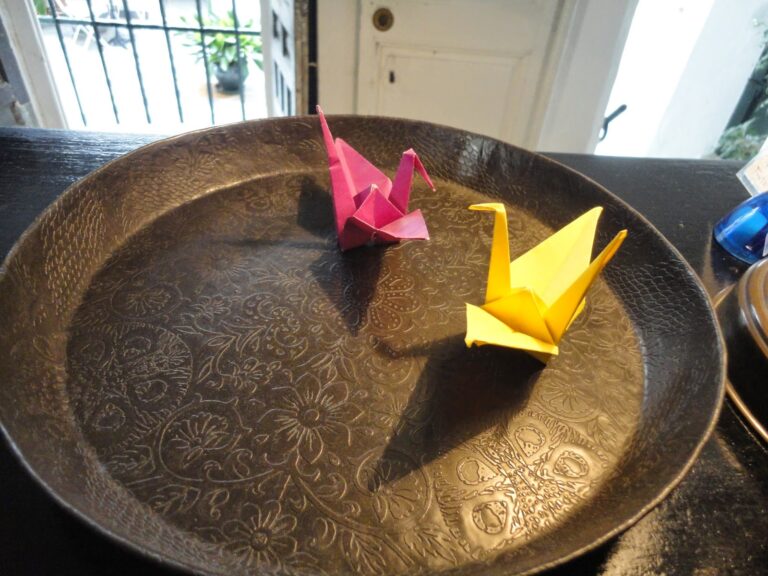 La grulla malva nos la regaló un cliente japonés, la amarilla la ha hecho Jazmín. Cae de la hoja y reemprende su vuelo la luciérnaga... Bashô Me encanta lo japonés - arte, costumbres, cine, poesía, artesanía, cocina...- aunque no tenga…