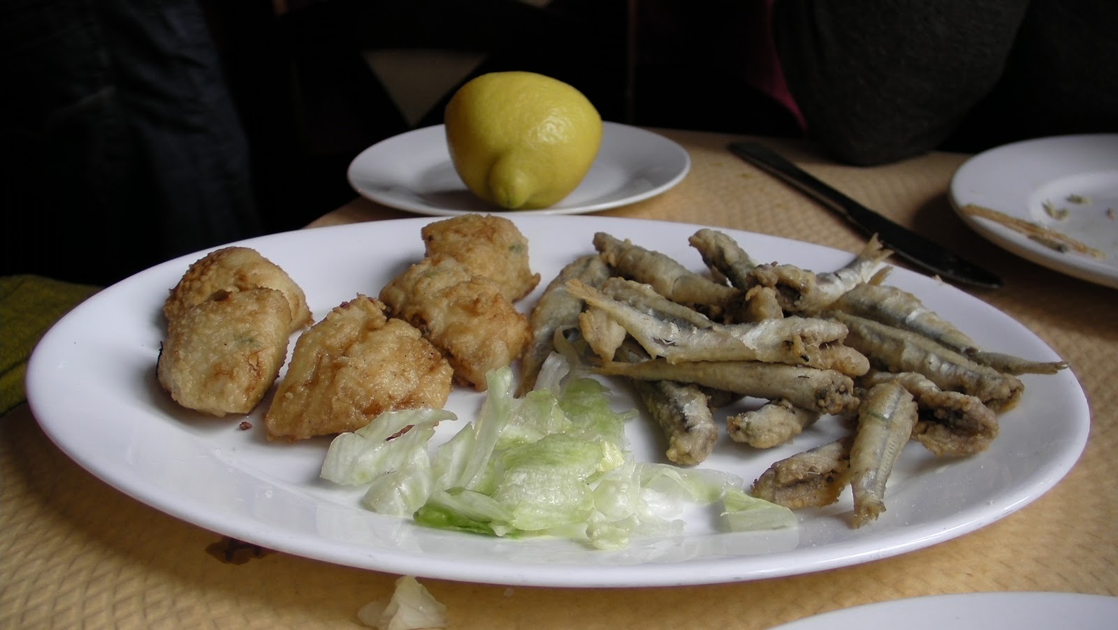 boquerones y dados de merluza fritos