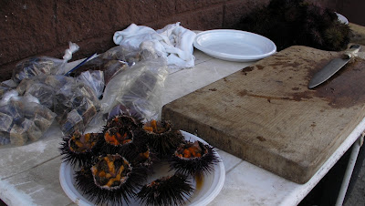 erizos de mar recién abiertos ( y pescados) en la cofradía de pescadores de San Fernando