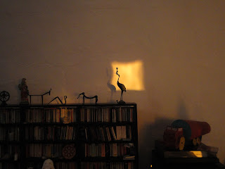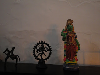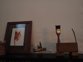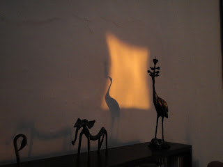 Animales, dioses y acuerelas: la grulla sobre la tortuga, símbolos chinos de buena fortuna, el estilizado Ganesh hindú, el protector, el clavo/cisne para atar el camello (algo imprescindible en estos tiempos), la cabra africana ( para no olvidar «la rauxa»que tira al querido monte), Minakshi la diosa hindú, con los ojos en forma de pez, Shiva, su esposo, el ciclo de la vida, símbolo del ritmo perpetuo de la destrucción y de la regeneración, el guerrero dogón antiguo y pequeñito, el gatopintor argentino, el barquito que cruza los mares desde el barrio de Palermo; las semillas de Ramón Herreros, el vestidito de pasta de papel, un guiño argentino a las lindas futilidades de la vida y, por último, Entrada de la mezquita de Urfa, una acuarela de Richard Hoare, todos ellos sonríen impasibles ante los últimos rayos del día desde el salón en La Casa Grande .