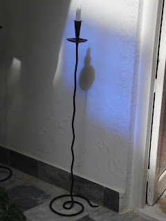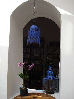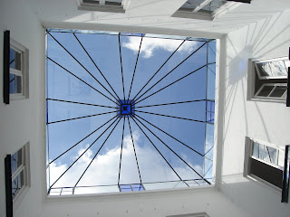 recorridos de luz: los detalles de cristal azul de la montera van coloreando el patio y marcan el paso del sol y de las estaciones