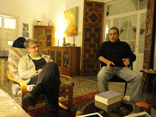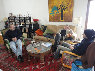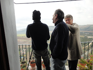 | Nuria y Hilari tras el rodaje con mi retrato al fondo |